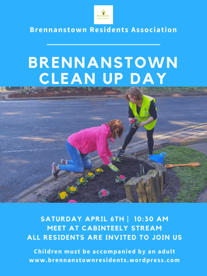 Brennanstown Residents Association Spring Clean. Meet at Cabinteely Stream 10.30am Saturday April 6th. All residents are invited to join us. We’ll have equipment provided by dlrcc and An Taisce National Spring Clean