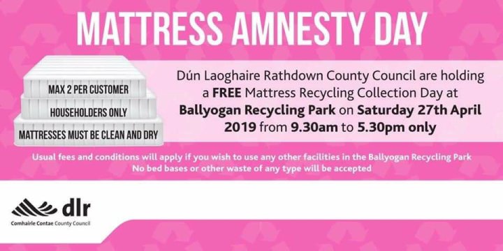 RecyclingFree Mattress Recycling Bring your old mattresses to Ballyogan Recycling Centre on Saturday April 27th between 9.30-5.30pm free of charge! Share this: Click to share on WhatsApp (Opens in new window) WhatsApp Click to share on Facebook (Opens in new window) Facebook Click to share on X (Opens in new window) X Click to email a link to a friend (Opens in new window) Email Click to share on LinkedIn (Opens in new window) LinkedIn Like Loading... Related