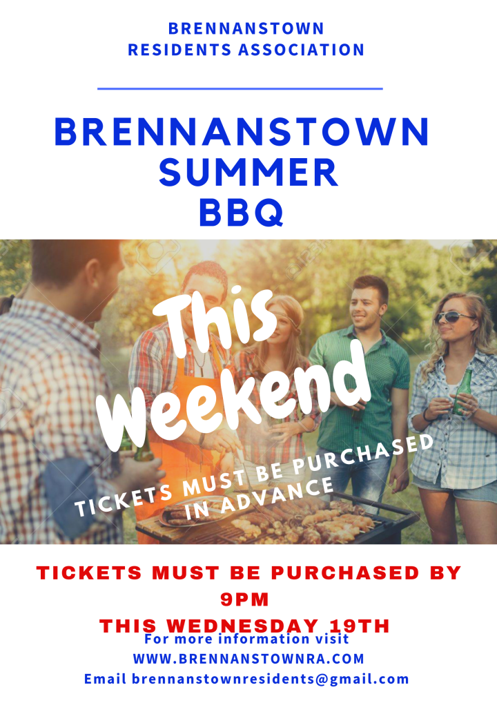 Have you got your tickets for the Summer BBQ this Saturday? Tickets must be purchased by 9pm this Wednesday. If you wish to order tickets, committee members will be in Brennanstown Square this eve from 5-6pm and Tuesday 730-8pm.