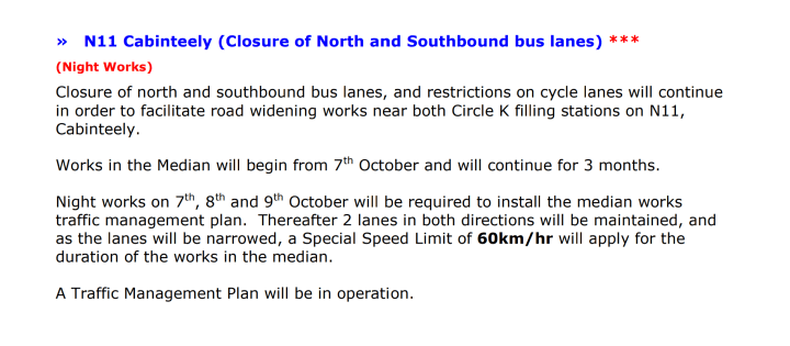Night works are scheduled to take place at the new Druids Glen Road for three nights (7th, 8th and 9th) this week. Noise may affect residents of Brennanstown.