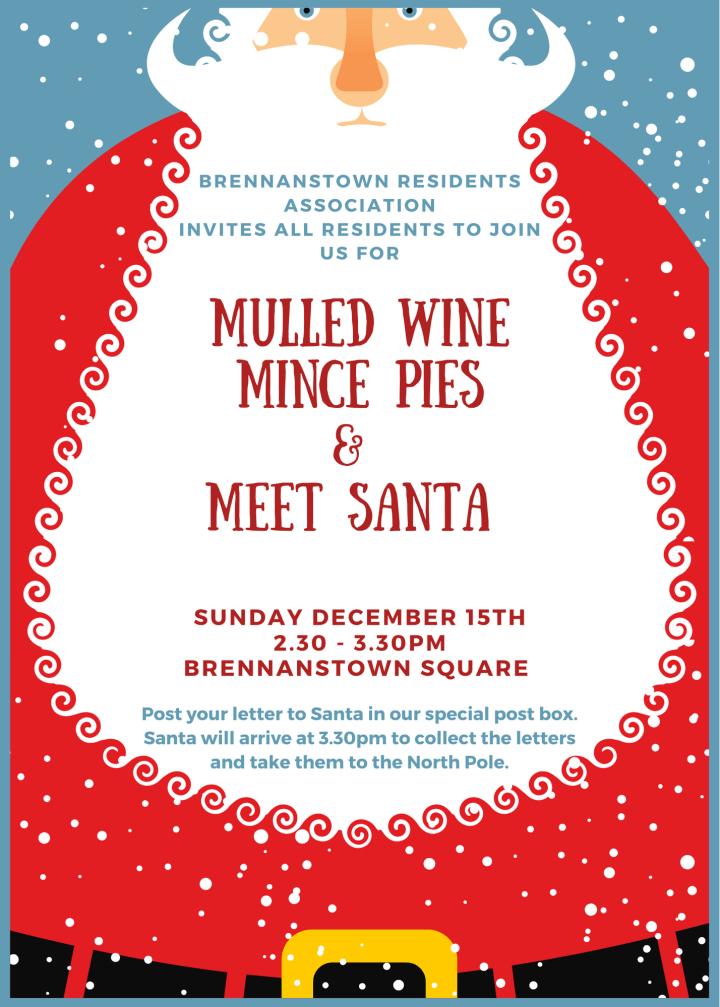 All residents are invited to join us for Mince Pies and Mulled Wine next Sunday 15th at 2.30pm, Brennanstown Square.