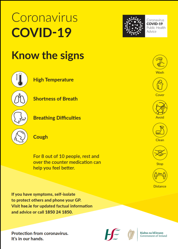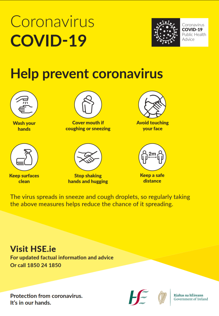 We have arranged for the latest HSE Covid-19 posters to be printed over the weekend and these will be put up on Monday once we get them back from the printers.