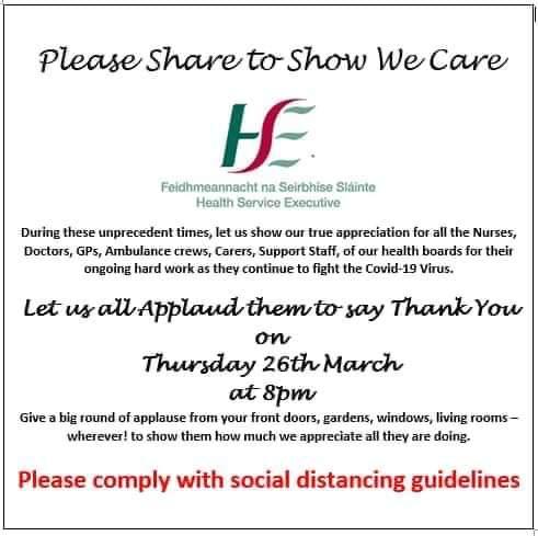 Don’t forget to give the HSE heroes a huge round of applause at 8pm tonight. Please go to your door, window or balcony and let them know how much we appreciate them.