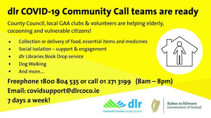 DĂşn Laoghaire Rathdown County Councils Community Call helpline is here to help 7 days a week, from 8am – 8pm. They can help with a range of services, including dog walking and delivering books from the library for you to read! Get in touch if you need any assistance. Call 1800 804 535
