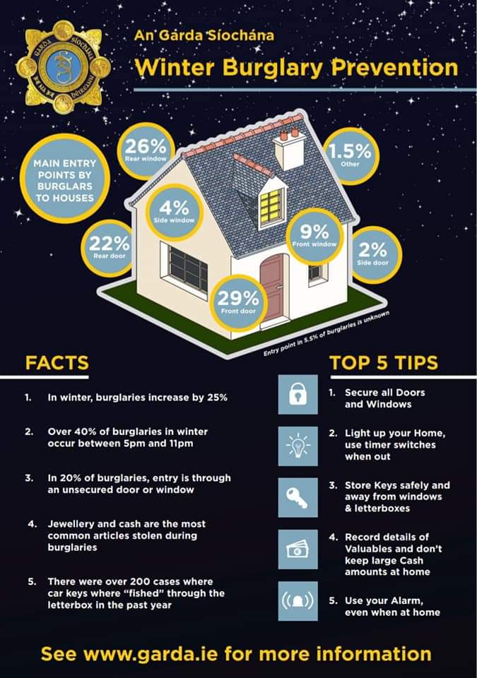 For more information on how to secure your home visit: https://www.garda.ie/en/Crime-Prevention/Securing-your-home/