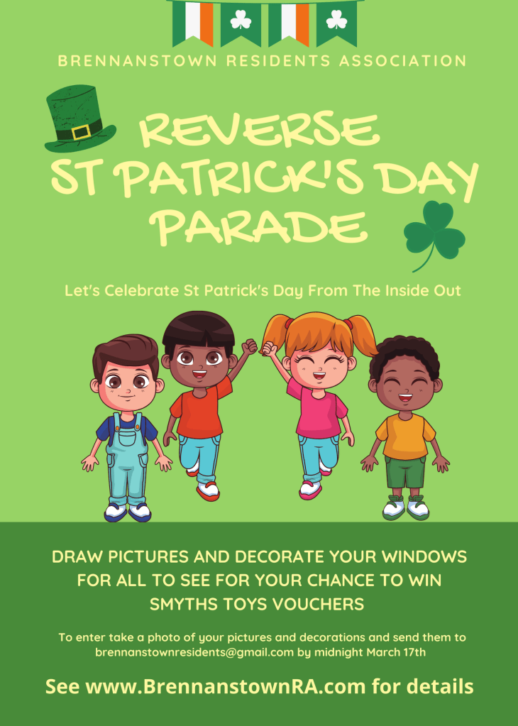 We understand the challenges of the lockdown and no parade again this year so we’ve decided to organise a Reverse St Patrick’s Day Parade!