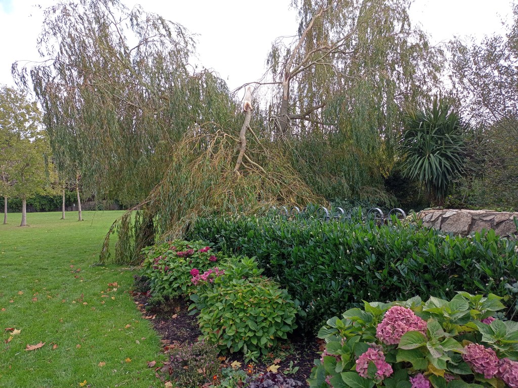 The large willow tree was damaged Saturday night with a large portion of it falling down. The residents association have been in touch with Dún Laoghaire Rathdown County Council parks dept and asked them to remove the fallen branch.