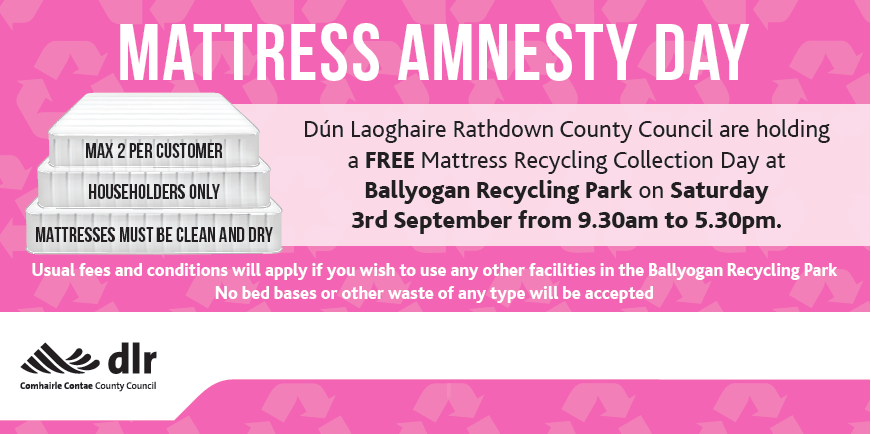 Dún Laoghaire Rathdown County Council FREE mattress recycling service will take place on Saturday 3rd September from 930am – 530pm at Ballyogan Recycling Centre.