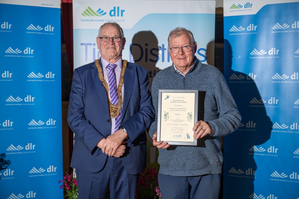 The icing on the cake is that in both 2024 and 2025 we have been recognised for our efforts to keep Residents informed and engaged. We won the ‘Community Engagement- Communication Award’ -worth €500 this year – which will go to beautifying our complex further. The Award was presented to Tom Robinson, Chairman of our Residents Association by An Cathaoirleach of Dun Laoghaire – Rathdown County Council -Jim Gildea – at the Awards ceremony in Dun Laoghaire’s Assembly Hall on Thursday 16th October 2025.