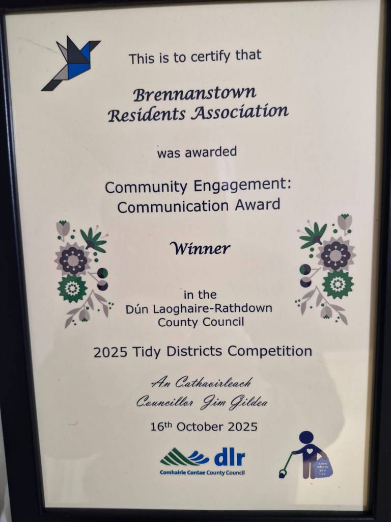 “Brennanstown have continued to excel in keeping residents informed and involved as they win another community engagement award this year. Their website is regularly updated, Activities are coordinated using their WhatsApp group with 127 members (up 30 from last year!) , 2 community A-frame noticeboards ensure visibility for clean-ups and coffee mornings. and an amazing 229 AGM invitations were hand-delivered this yeart!